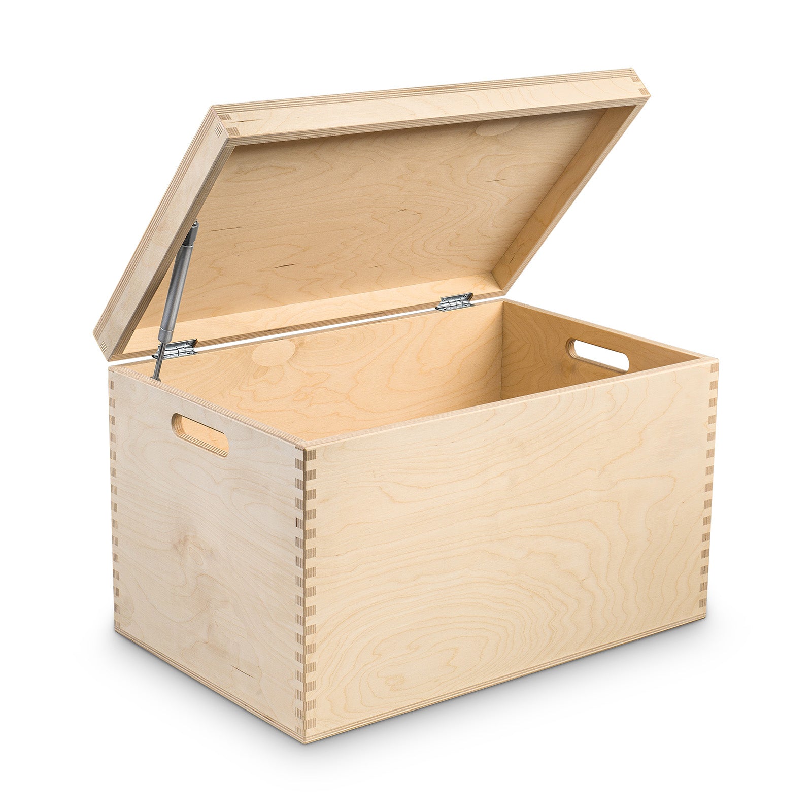 Die Kisten sind abgerundet (2mm) an den Kanten. Darüber hinaus verhindert die Gasdruckfeder, dass der Deckel schnell zufallen kann. Bei der "de luxe" Version ist der Deckel abnehmbar und kann daher auch nicht zufallen.